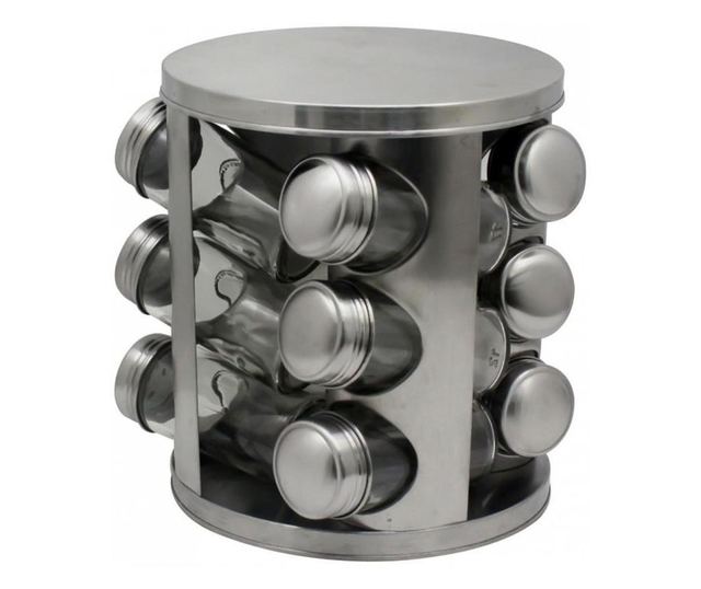 - Suport pentru condimente din otel inoxidabil (Inox) - 3 nivele - 12 borcane de sticla cu capace din otel inoxidabil - Baza rotativa - Capacitatea unui borcan: 80 ml - Inaltime suport: 19 cm - Diametru suport: 17 cm