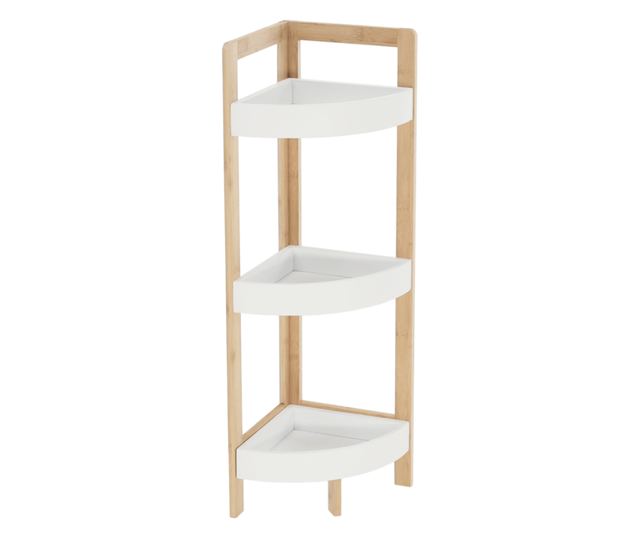 Raft de colt FONG Material: MDF/ Bambus lacuit Culoare: Alb / Bambus natur Dimensiuni: Latime 23 cm x Adancime 23 cm x Inaltime 77 cm Greutate: 3 kg Produs slovac de calitate. Se livreaza demontat