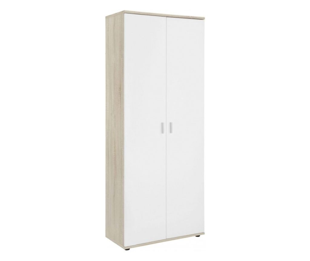 Dulap pentru incaltaminte spatios, intr-o combinatie de culoare sonoma si alb. In interiorul dulapului sunt cinci rafturi fixe, cu spatiu pentru 12 pana la 18 perechi de pantofi. Dulapul este din PAL de calitate, iar manerele usilor sunt din metal. Dimensiune: 69x35x176 cm
