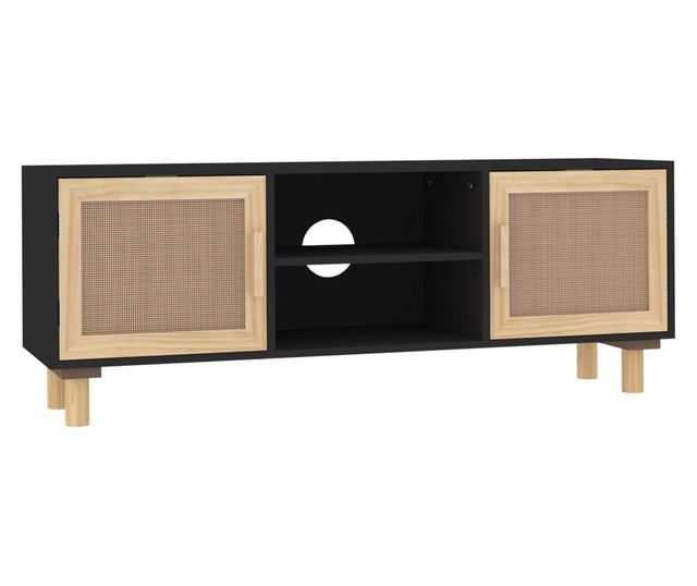 Comodă TV, negru, 105x30x40 cm lemn masiv pin și ratan natural