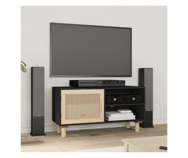 Comodă TV, negru, 80x30x40 cm, lemn masiv pin și ratan natural