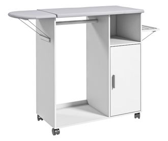 Acest dulap de calcat HOMCOM este in masura sa ofere tot spatiul de care aveti nevoie pentru hainele dvs.. Mica dar completa, structura este formata dintr-un raft de depozitare, un dulap pe 2 nivele si un spatiu deschis pentru agatat hainele. In plus, dulapul cu masa de calcat are o suprafata de calcat care este si pliabila, precum si patru roti pivotante pentru a-l muta cu usurinta oriunde doriti.- Un cuier, un dulap cu usa si un raft disponibil pentru depozitarea hainelor; - Raftul de sus si raftul lateral captusite sunt potrivite pentru calcat; - 4 roti cu 2 frane va permit deplasarea cu usurinta a mobilierului; - Constructie solida din PAL de calitate pentru utilizarea de zi cu zi; - Maner din aluminiu si balamale din otel ale dulapului pentru a permite deschiderea si inchiderea usoara; - Necesita montaj;- Culoare: Alb; - Materiale: PAL, tesatura efect in (100% poliester), burete; - Dimensiuni totale: 127L x 42.5P x 99A cm; - Dimensiunile blatului de lucru: 107L x 42.5P x 3A cm (total), 27L x 42.5P x 3Hcm (pliat); - Sina pentru agatat haine: Ø3 x 45L cm; - Spatiu total pentru a agata haine: 45.5L x 38P x 88A cm. - Dimensiuni raft lateral: 32L x 20P x 1.5A cm; - Dimensiuni raft deschis: 29.5L x 38P x 26.4A cm; - Dimensiunile interioare ale dulapului: 29.5L x 38P x 60A cm; - Greutate sustinuta: 35 kg (total), 10 kg (partea superioara), 8 kg (sina pentru agatat haine), 5 kg (raft); - Cod produs: 831-639V80WT;