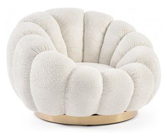 Material cadru: Lemn Material tapiterie: Textil plusat Material captuseala sezut: Spuma poliuretanica, densitate 25 kg/mc Material captuseala spatar: Spuma poliuretanica, densitate 18 kg/mc Inel decorativ auriu ca baza. Rotativ la 360 de grade. Dimensiuni: Latime 86 cm x Adancime sezut 62 cm x Inaltime 72 cm x Inaltime sezut fata de sol 30 cm x Inaltime cotiere fata de sol 48 cm Culoare: Crem / Auriu