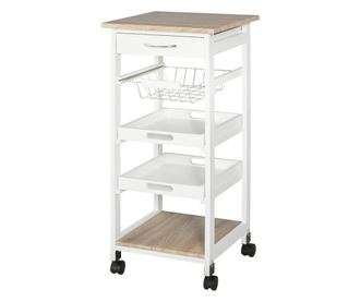 Acest carucior de bucatarie HOMCOM cu dimensiuni compacte, ofera mult spatiu suplimentar, perfect pentru bucatariile mai mici! Are un sertar, un cos de sarma metalica, tavite detasabile si o etajera pentru a-ti reorganiza toate ustensilele. 4 roti pentru transport confortabil, culoare alb si stejar, foarte elegant. Tot spatiul de care ai nevoie pentru a-ti reorganiza accesoriile si pentru a le avea intotdeauna gata de utilizare.- Are un sertar, un cos de sarma metalica, tavite detasabile si o etajera pentru a-ti reorganiza toate ustensilele;- Fiecare tavita poate fi utilizata ca si tava de servire independenta;- Structura din lemn de pin, suprafata de lucru cu vinisoare tip lemn, garanteaza durata si usurinta de curatare;- 4 roti netede si cu role asigura mobilitatea;- Design compact si roti flexibile, perfect pentru o bucatarie mica;- Asamblare necesara- Culoare: Alb, Stejar;- Material: Lemn de pin, MDF;- Dimensiune generala: 37L x 37L x 82Icm;- Dimensiuni ale sertarului interior: 26.8L x 28L x 5.2Icm;- Dimensiuni ale cosului metalic: 28L x 29.5L x 6.2Icm;- Dimensiuni ale tavii: 30L x 25.5L x 3Icm;- Capacitate greutate: 40kg (total), 5kg (tava), 3kg (sertar)