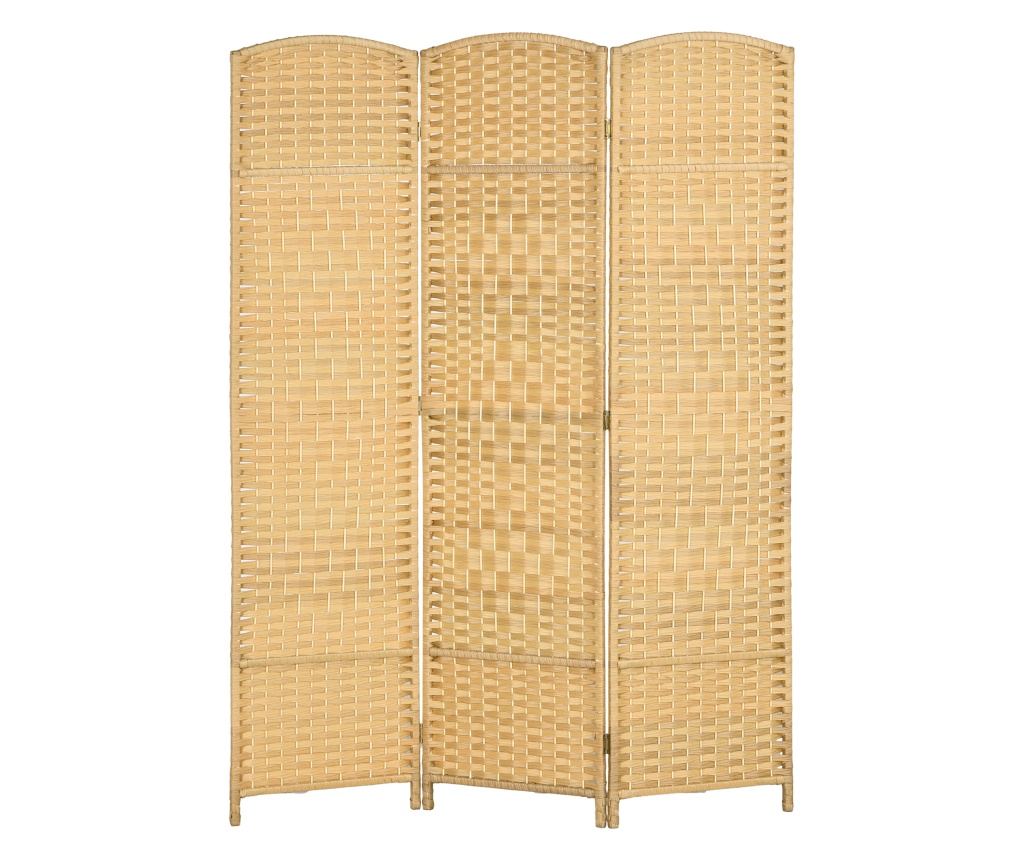 Reda viata spatiului tau cu paravanul pliant HOMCOM. Realizat din polipropilen, ofera intimitate si o rezistenta superioara comparativ cu materialele clasice din fibra de hartie. Designul pliant cu 3 panouri, cu 6 balamale metalice, combina stilul cu practicitatea. Structura din lemn de pin impletita cu polipropilen si un elegant design arcuit fac din acest paravan un element de decor perfect pentru orice spatiu.- Paravan pliant cu 3 panouri si 6 balamale metalice pentru a fi depozitat ocupand un spatiu minim - Design usor care faciliteaza mutarea - Finisaj impletit cu partea superioara arcuita pentru o nota de eleganta - Separator de camere ideal pentru a crea un colt intim sau a adauga un fundal decorativ in orice incapere - Cadru din lemn masiv de pin care ofera un suport puternic - Polipropilena asigura mai multa intimitate si o durata mai mare de viata - Nu necesita asamblare- Culoare: Lemn natural - Materiale: Polipropilen, lemn de pin - Dimensiuni totale: 135L x 1,7P x 180Icm - Dimensiuni pliat: 45L x 5,1P x 180I cm - Dimensiunile unui singur panou: 45L x 1,7P x 180I cm - Inaltimea piciorului: 6,5 cm- 1 x Paravan despartitor interior - 1 x Manual de instructiuni