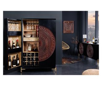 Acest dulap bar de lux Vstyle Irresistible 288058 are un design 3D sculptat manual pe uși, transformând fiecare piesă într-o operă de artă unică. Combinația de negru elegant cu detalii de cupru și auriu aduce un plus de sofisticare oricărui spațiu, în timp ce lemnul masiv de mango asigură durabilitate și stabilitate. Cu dimensiunile de 95 cm lățime, 141 cm înălțime și 42 cm adâncime, dulapul oferă spațiu amplu pentru vase și sticle. Compartimentul superior măsoară 90 cm x 16 cm x 26 cm, iar compartimentul mai mare fără raft interior măsoară 90 cm x 35 cm x 38 cm. Compartimentul inferior măsoară 90 cm x 31 cm x 37 cm, cu două sertare de 40 cm x 6 cm x 22 cm pentru o organizare ordonată. Ușile cu închidere magnetică asigură ușurință în utilizare.