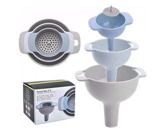 - Design multifuncțional: Include pâlnii de diferite dimensiuni și un filtru pentru diverse sarcini de bucătărie