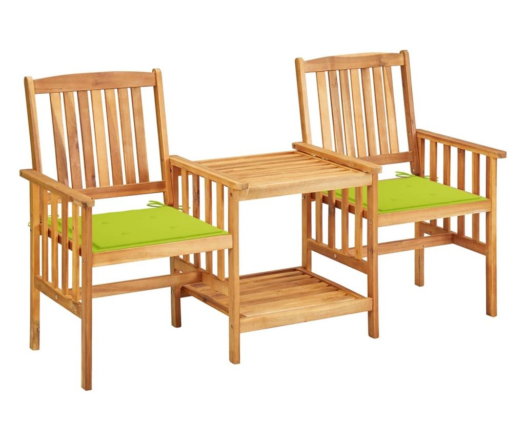 Masa și scaunele sunt realizate din lemn masiv de acacia cu finisaj de ulei, fiind deosebit de durabile și rezistente. Blatul robust și raftul inferior sunt ideale pentru păstrarea ceștilor, cărților și a altor obiecte mici. Spătarele și brațele scaunelor asigură un confort optim la ședere. În plus, datorită finisajului cu ulei, mobilierul este ușor de curățat cu o cârpă umedă. Pernele adaugă un plus de confort. Fiecare pernă are două seturi de șnururi, pentru o bună fixare pe setul de bistro.
