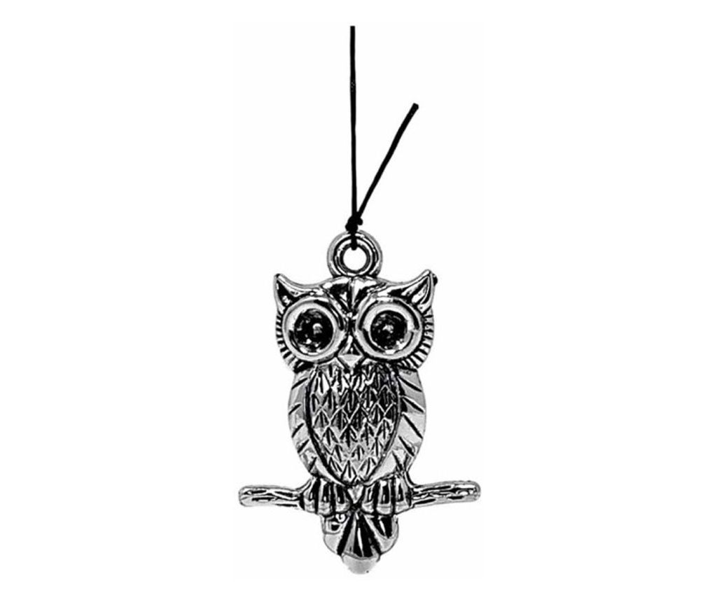Clopotel de vant cu 5 tuburi sonore metalice argintii pentru casa sau gradina, model Feng-Shui cu bufnite