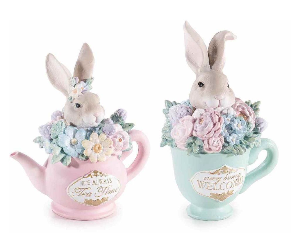 Figurina Iepuras Paste Girl din polirasina alb verde 15 cm x 13 cm x 37 h